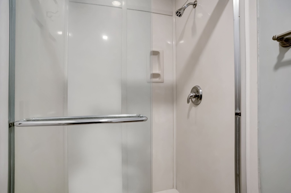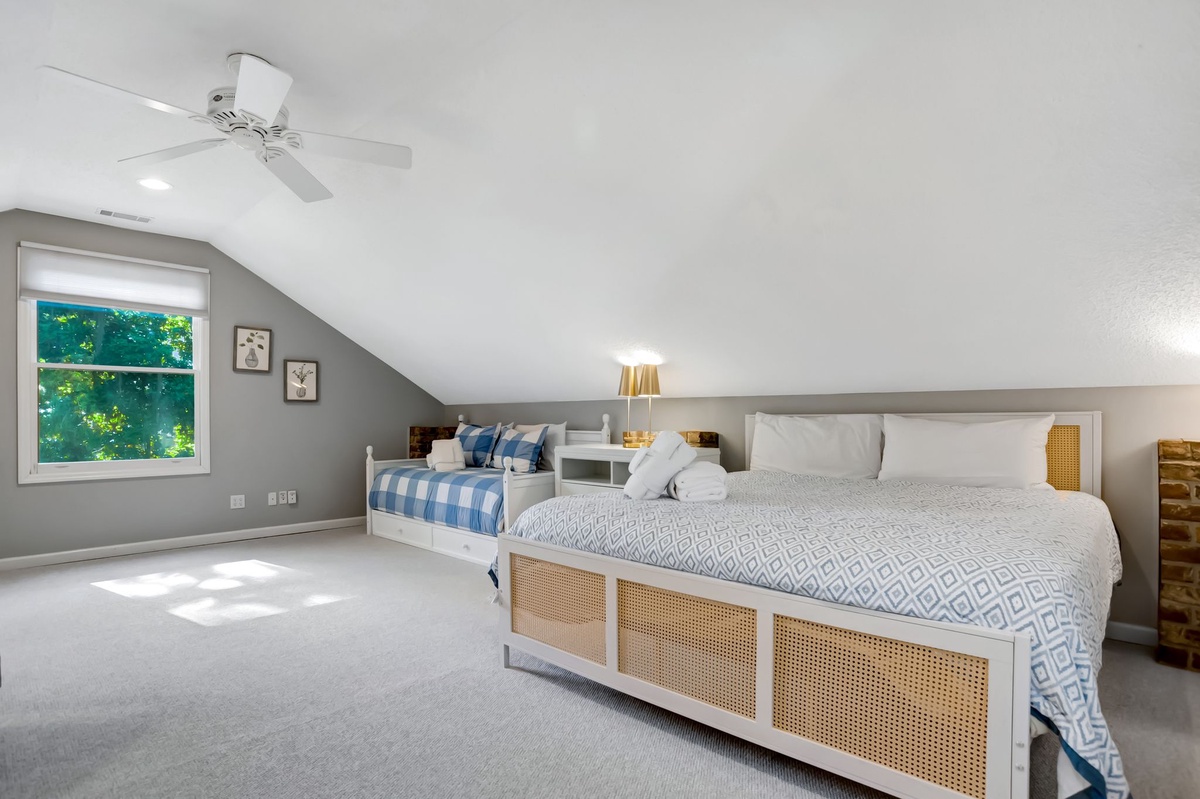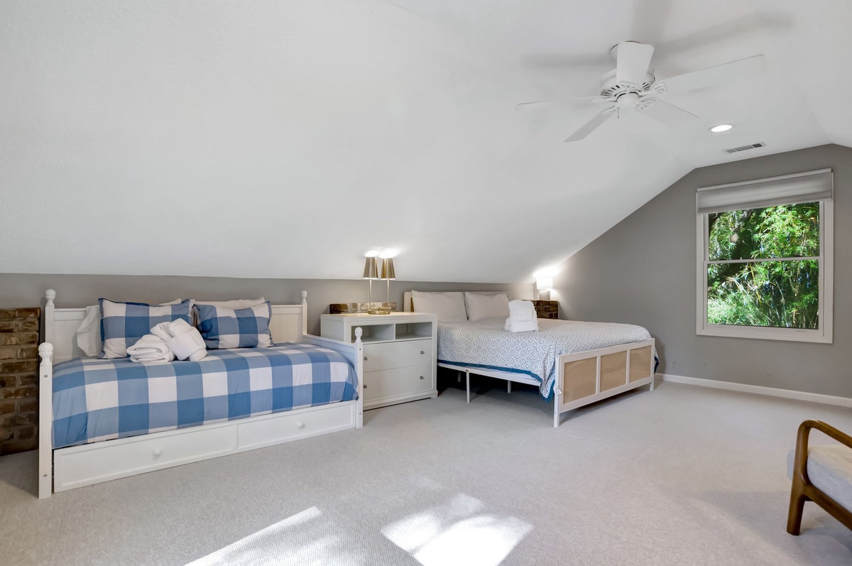 The first of four guestrooms enjoys lush privacy, set up a discrete set of stairs from the downstairs lounge. Here in a carriage house atmosphere, you’ll find a king bed and twin bed with twin trundle beneath arched ceilings, with an armchair and a flat-screen TV dotting a space rife with charming brick accents. This room enjoys access to a full bath on the ground floor with walk-in shower.