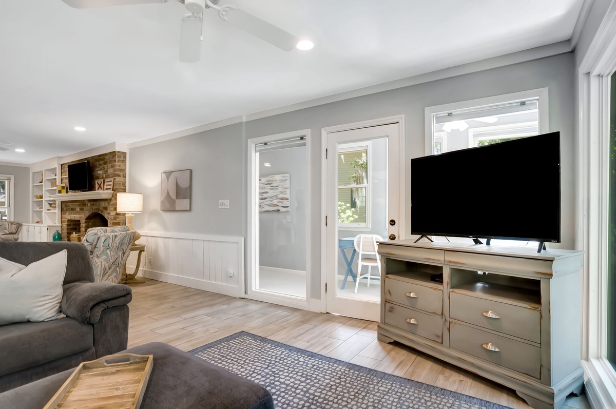 The open floor plan of the main living space circles around a central staircase, guiding you first to a formal living room informed by a Southern sense of style with its decorative Savannah brick fireplace and built-in cabinetry. Here you can unwind in one of the main armchairs or on the plush sofa and enjoy rousing conversation or a show on the large flat-screen smart TV. This home offers streaming capabilities ONLY. No cable TV is provided.