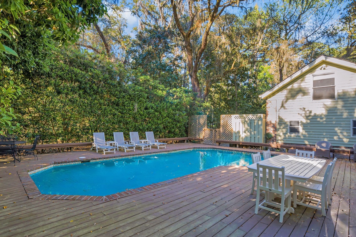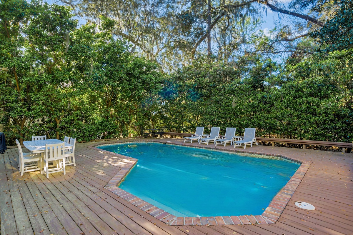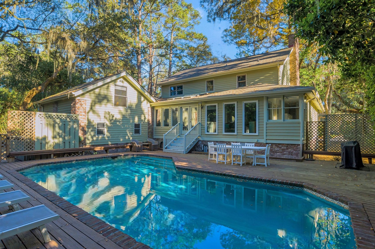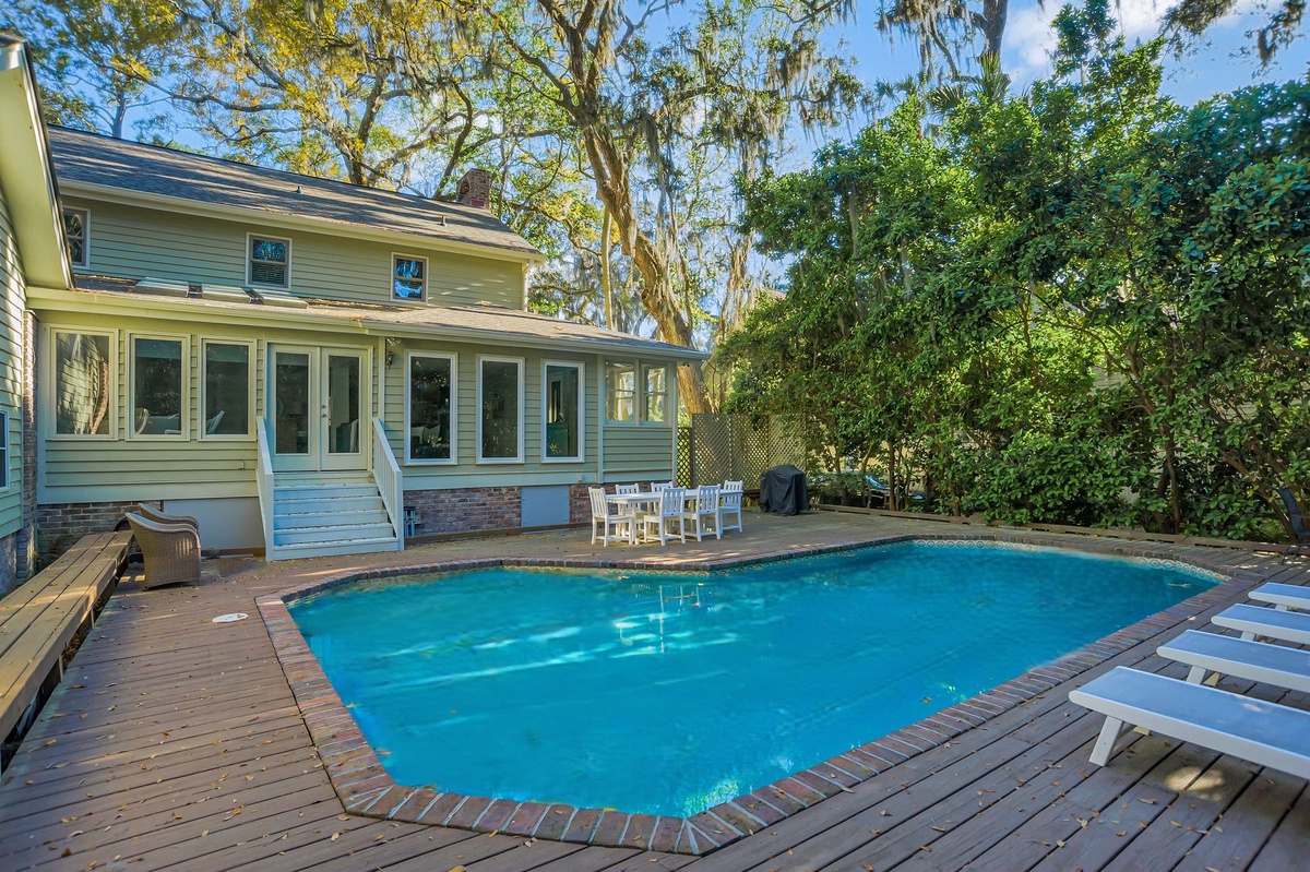 As outdoor living is key to the Hilton Head Island experience, here you’ll find a backyard paradise just beyond the back door. Dappled with shade from old-growth trees, this brick-and-teak circles the sparkling waters of a resort-depth pool, complete with multiple chaise lounges and al fresco dining for six.