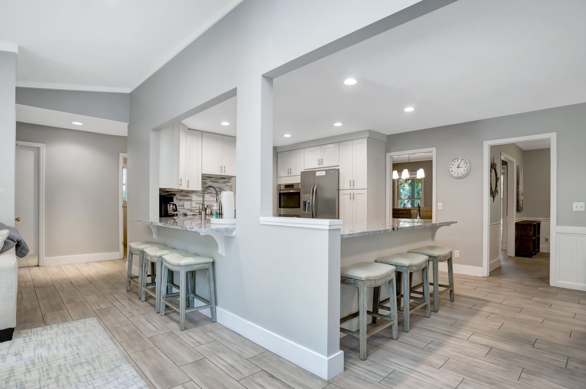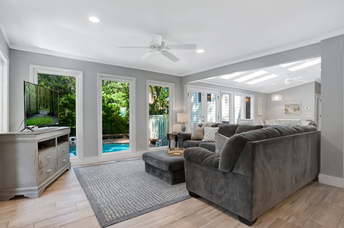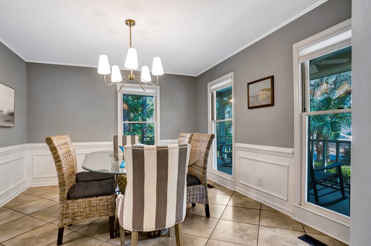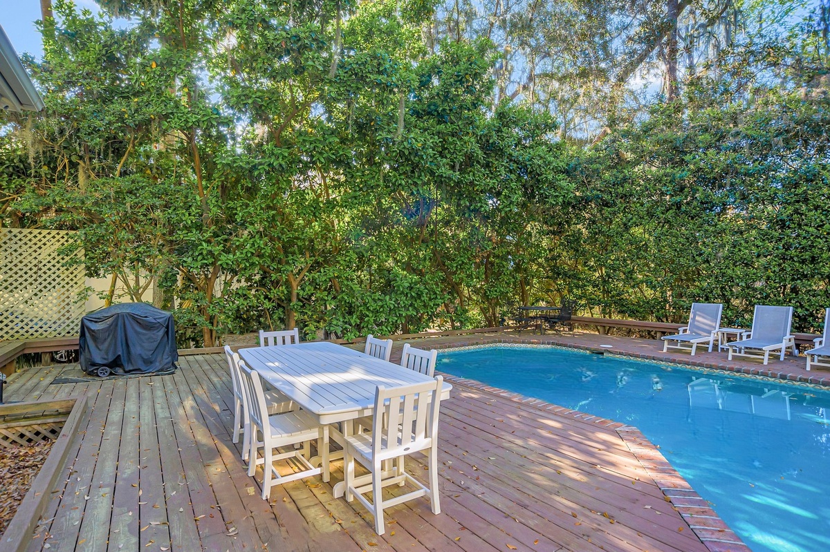 As outdoor living is key to the Hilton Head Island experience, here you’ll find a backyard paradise just beyond the back door. Dappled with shade from old-growth trees, this brick-and-teak circles the sparkling waters of a resort-depth pool, complete with multiple chaise lounges and al fresco dining for six.