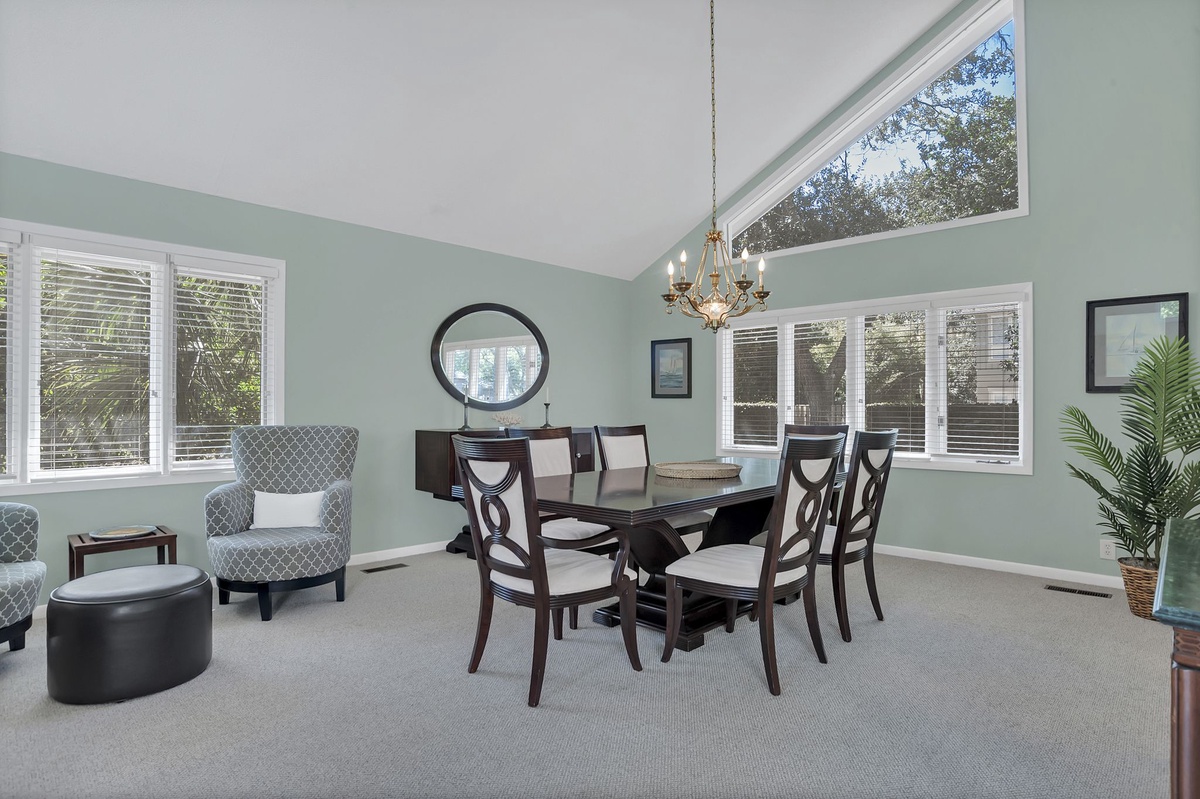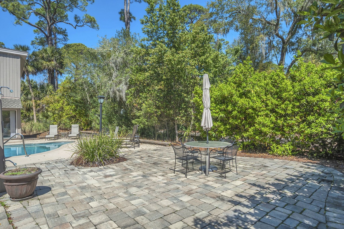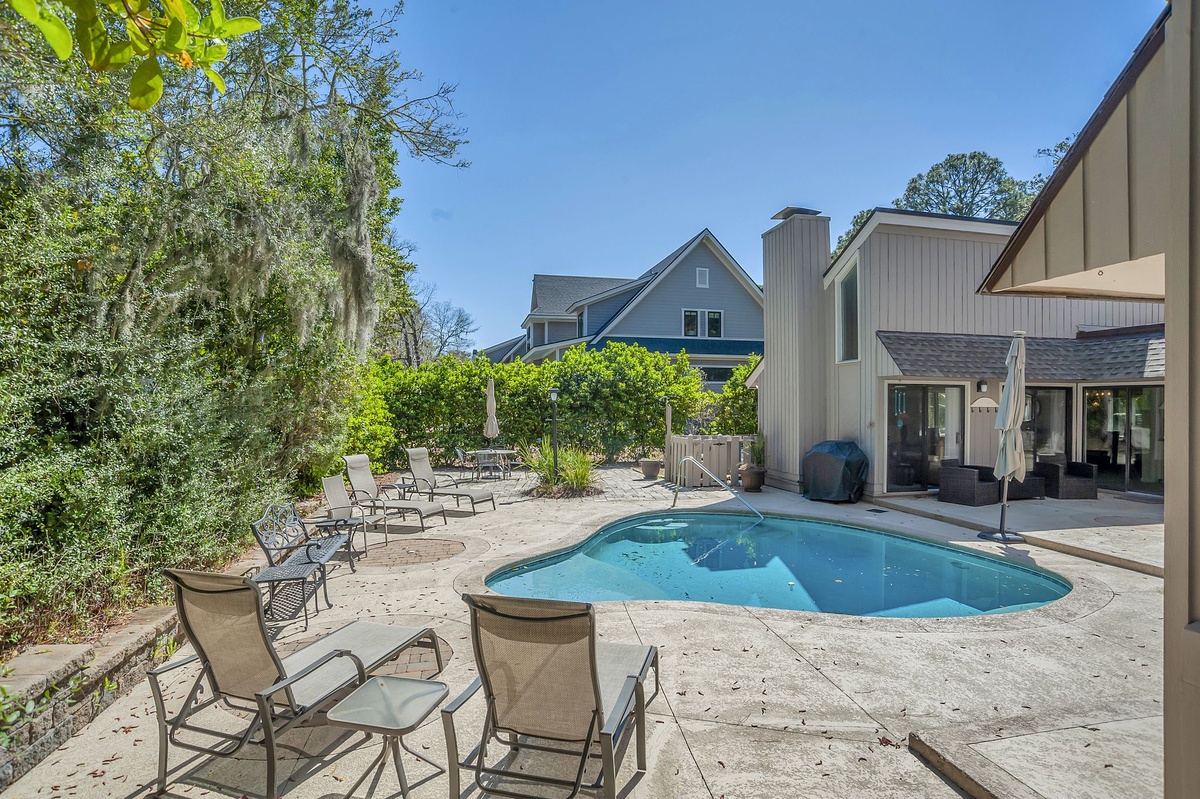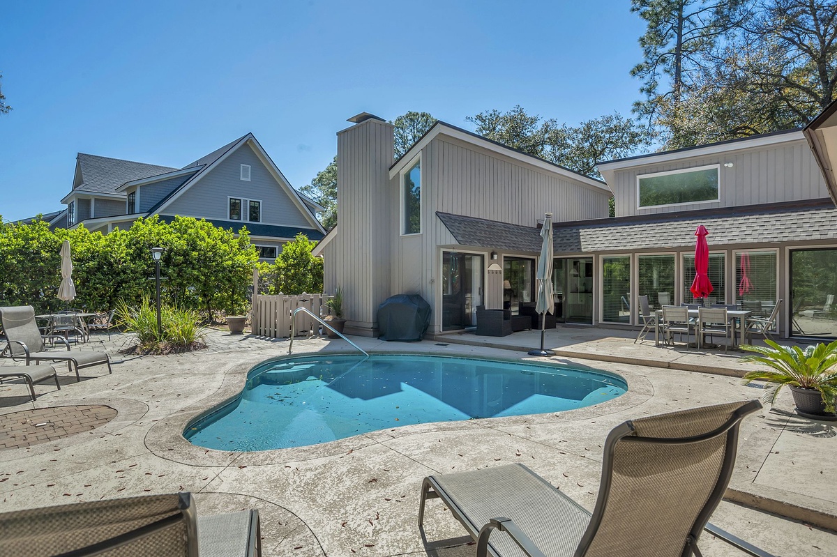 Oriented around a fabulous outdoor living space, 9 Ruddy Turnstone offers unbeatable indoor/outdoor living on a quiet street just inside Sea Pines’ Ocean Gate. The outdoor living greets you almost immediately upon entry, showcased through floor-to-ceiling windows that surround it courtyard-style. Beyond sliders, step out to an outdoor showcase of Hilton Head’s natural beauty, with al fresco dining for up to twelve, multiple chaise lounges, outdoor shower and lush landscaping surrounding a sparkling resort-style swimming pool. Follow a path through the bushes and you’re just steps away from the beach.
