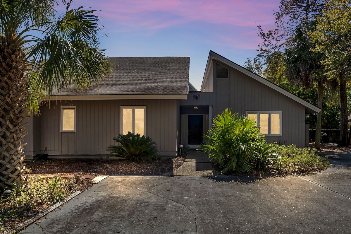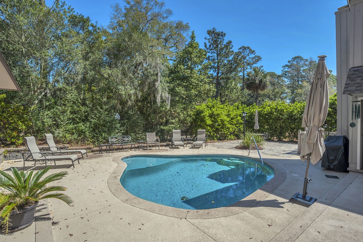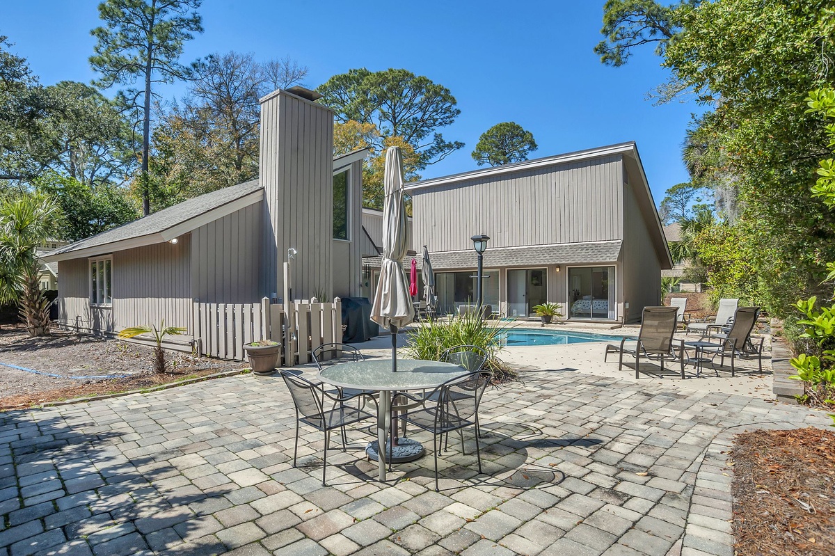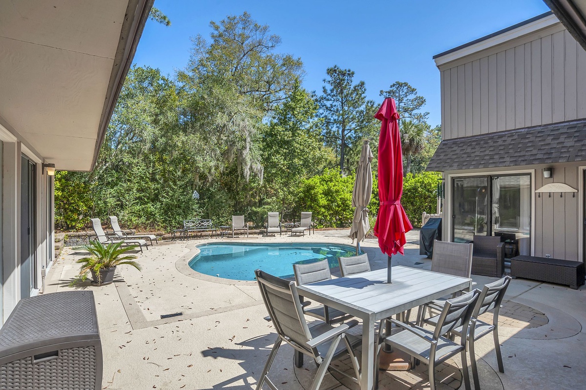 Oriented around a fabulous outdoor living space, 9 Ruddy Turnstone offers unbeatable indoor/outdoor living on a quiet street just inside Sea Pines’ Ocean Gate. The outdoor living greets you almost immediately upon entry, showcased through floor-to-ceiling windows that surround it courtyard-style. Beyond sliders, step out to an outdoor showcase of Hilton Head’s natural beauty, with al fresco dining for up to twelve, multiple chaise lounges, outdoor shower and lush landscaping surrounding a sparkling resort-style swimming pool. Follow a path through the bushes and you’re just steps away from the beach.