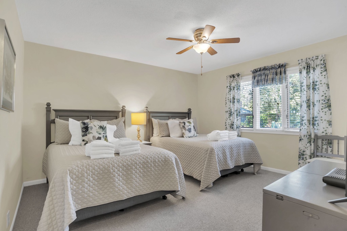 The first of the property’s three beautiful suites offers a pair of double beds beneath a ceiling fan, with flat-screen TV and a wonderfully updated en suite boasting wide stone vanity, tub and shower. The next, set behind a set of French doors, offers a queen-size bed beneath cathedral ceiling, with ceiling fan, flat-screen TV and updated en suite with walk-in shower. The final, serving as a primary suite, sees a king-size bed resting beneath a soaring tray ceiling with ceiling fan, flat-screen TV, private access to the outdoors and en suite bath with walk-in shower.