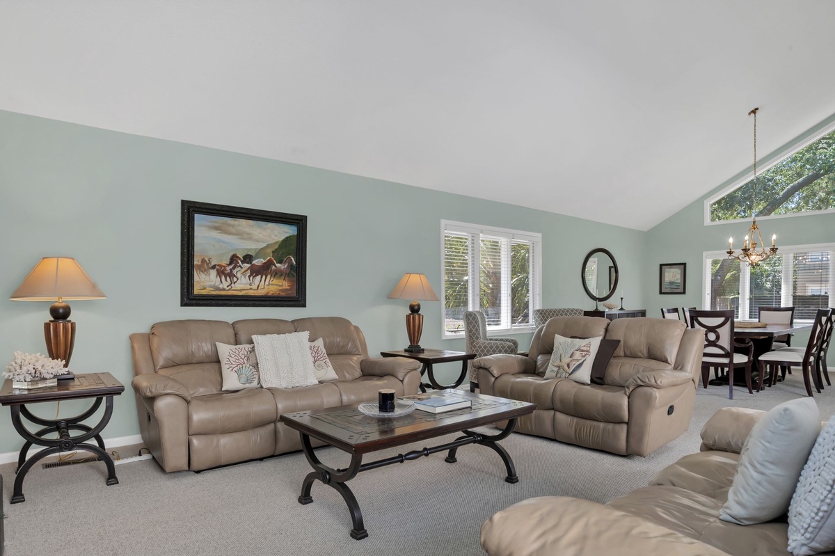 Inside, every effort has been made to create just as much dazzling comfort within. Down a hallway of wide-plank tile, we come to informal dining for six set beside the wide stone counters of the kitchen, with updated appliances and easy access to a full laundry. Passing through a butler’s pantry, we come to the formal dining room which seats six beneath soaring vaulted ceilings. This space extends into a spacious living room, with plush leather loveseats and sofa concealing hidden recliners set before a flat-screen TV and decorative fireplace. A nearby wet bar makes entertaining a breeze.