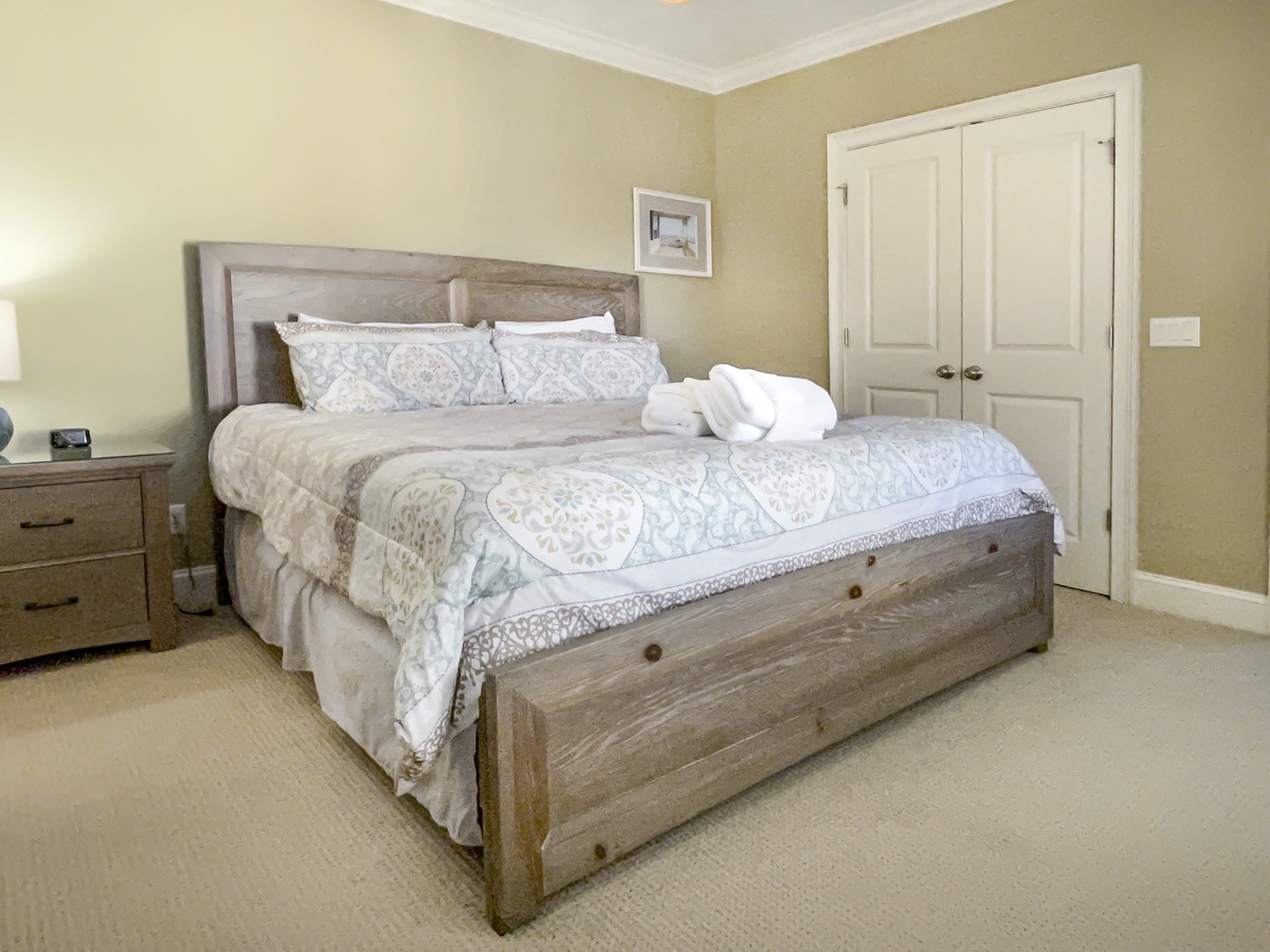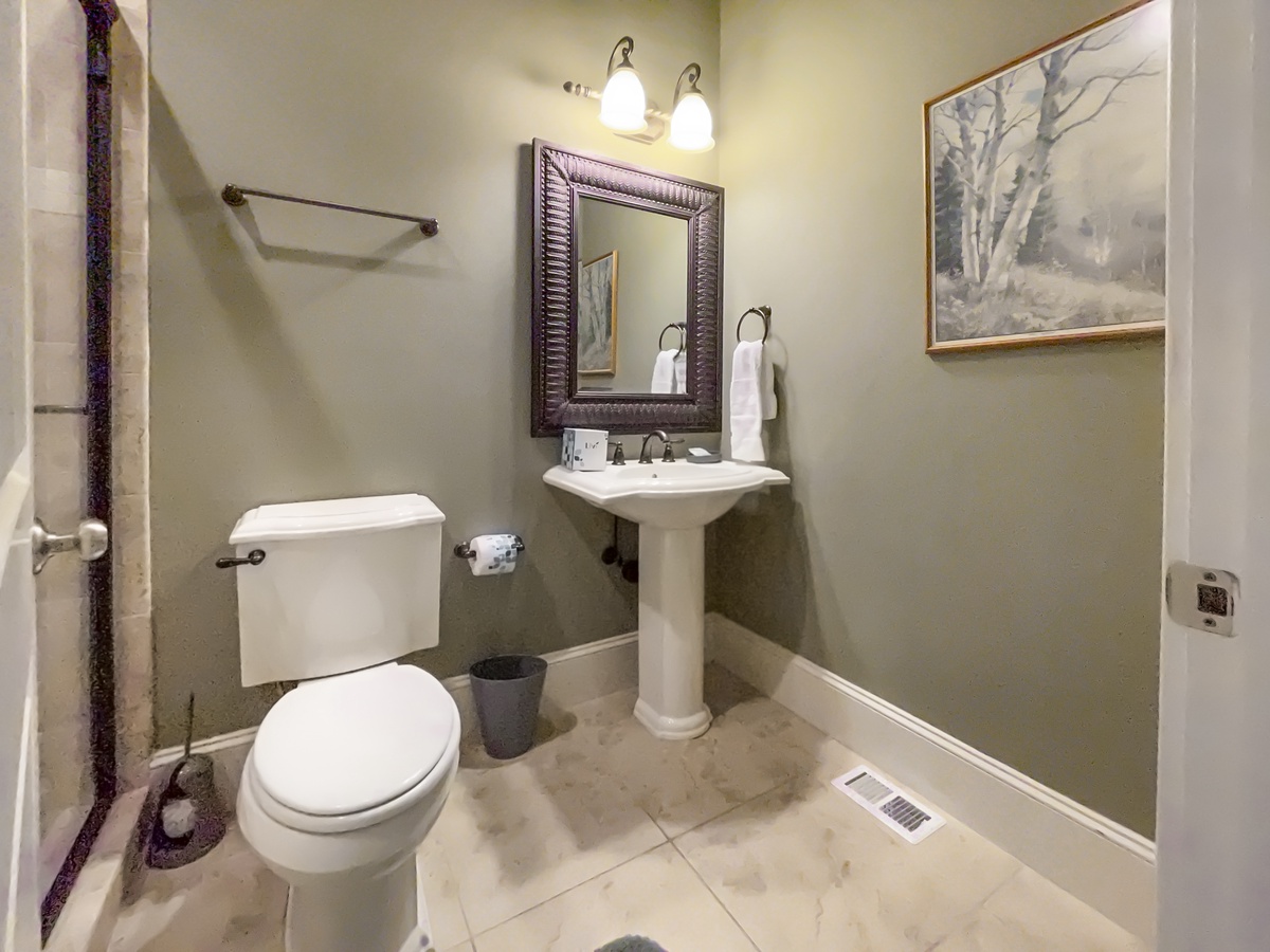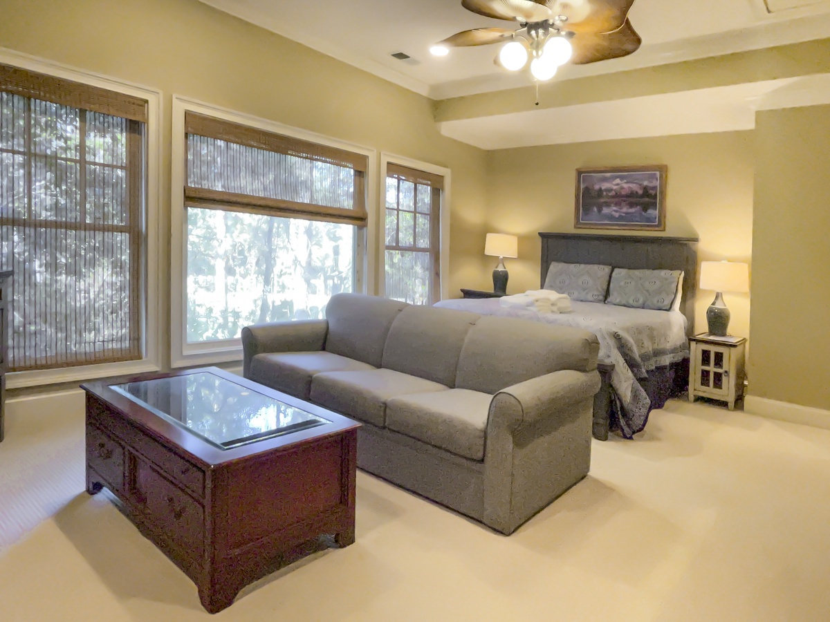 Along with a full laundry and full bath, the first story hosts the opulent master suite, where wide windows coax in natural light and a spacious king size bed anchors a space with tall ceilings, flat-screen TV, ceiling fan and spa like en suite with jacuzzi soaking tub and cavernous walk-in shower.