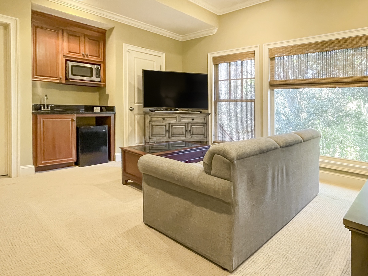 The remaining guest rooms can be found atop a set of stairs illuminated by tall windows and skylights. In one, coastal Caribbean flair informs a sanctuary with king size bed and wide windows. In the other, a queen size bed and sleeper sofa offer respite in a full resort-style space with flat-screen TV and kitchenette boasting minifridge, sink and microwave. These two guest rooms share access to a spacious private bath with walk-in shower.