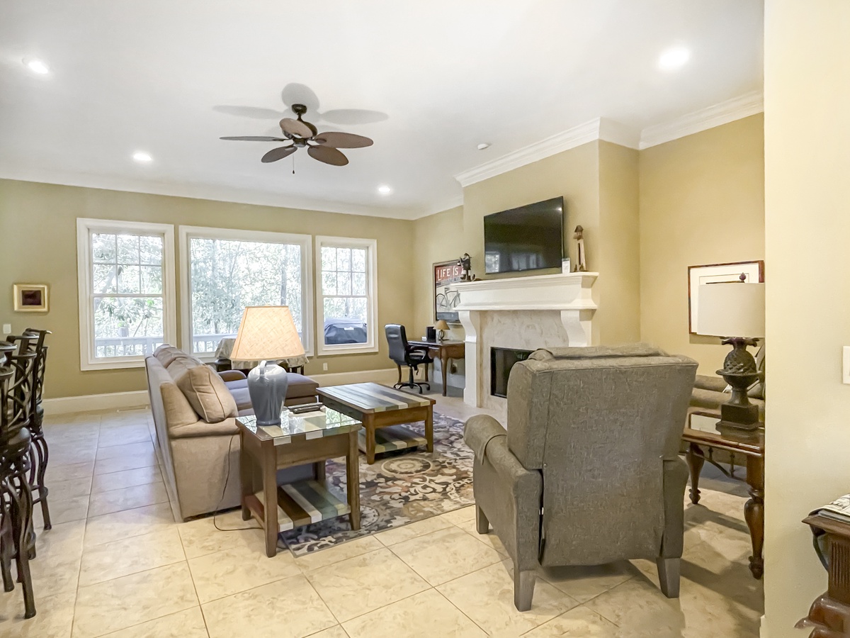A delightful atmosphere of open airiness greets you as you enter, with sightlines that stretch right out to rich verdant forests beyond wide windows. To one side of this view, the sprawling open kitchen rings black granite counters around a full suite of gourmet stainless steel appliances. Past the bar seating for four that lines one side of the kitchen, a spacious great room sees a chaise lounge with sleeper, armchairs and a gaming table arrayed before a grand decorative fireplace with flat-screen TV.