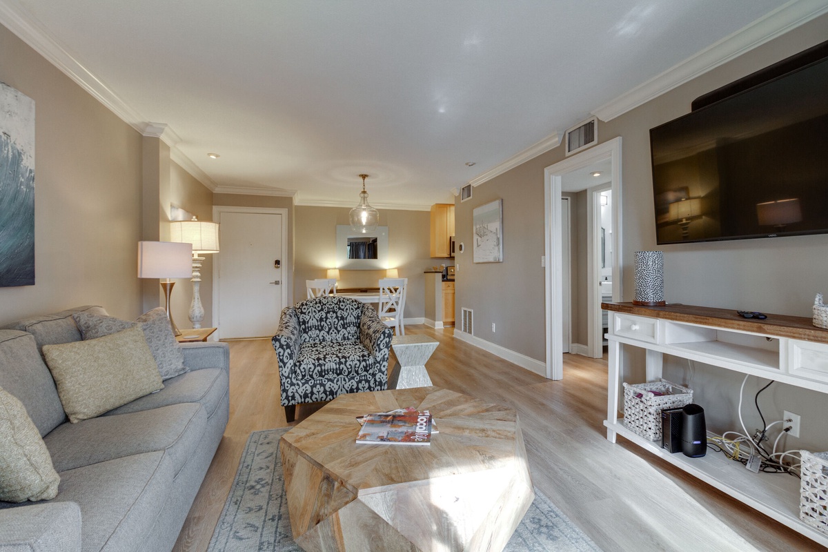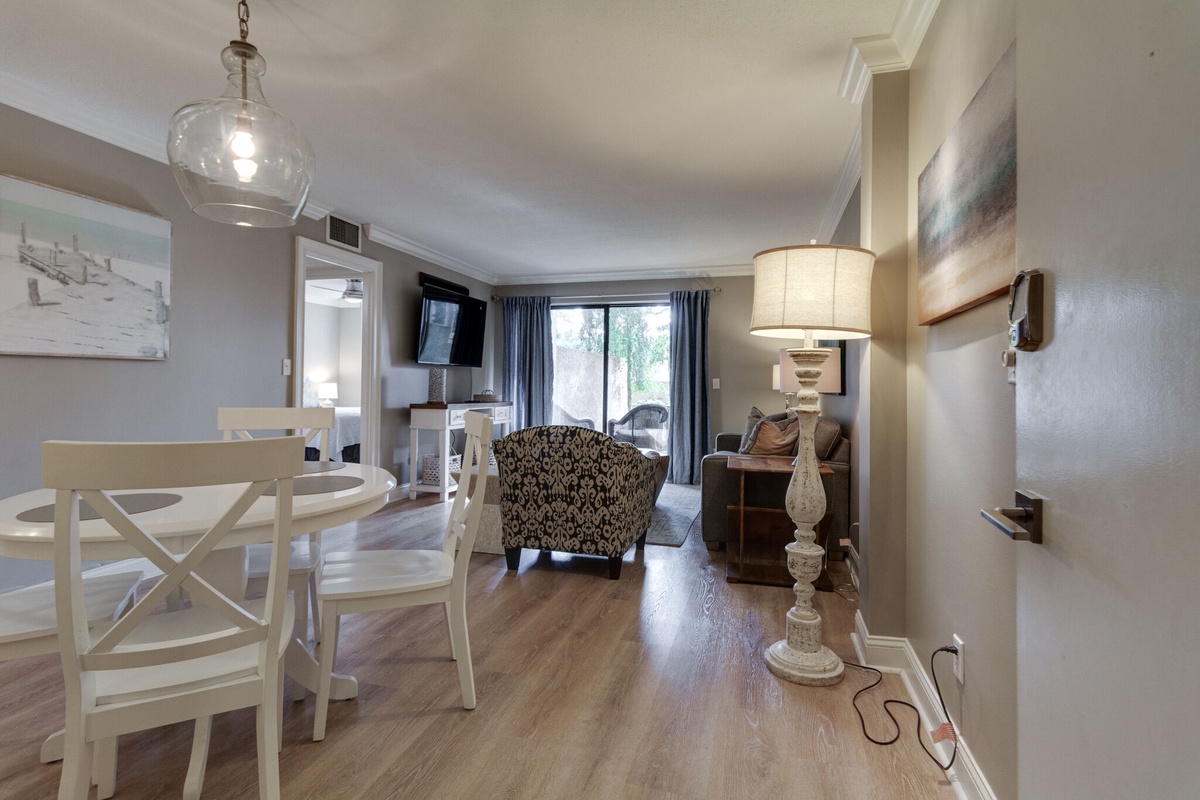 The adjacent dining area seats four stylishly. The fully-equipped kitchen boasts abundant workspace, cookware, dishes, and glassware. Hardwood floors lead to the spacious master suite. A plantation-shuttered, floor-to-ceiling window invites sunshine. Relax on the king-sized bed while streaming your favorite shows on the large flat screen TV. The private bath features a walk-in shower.