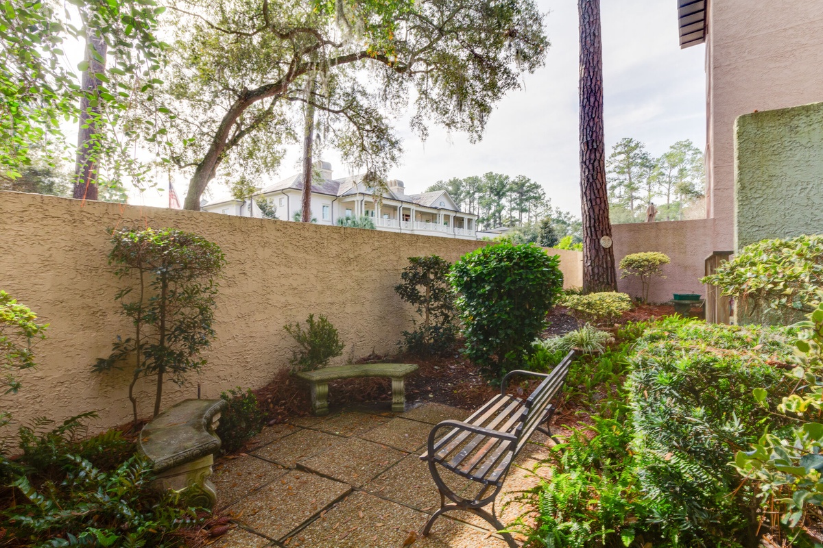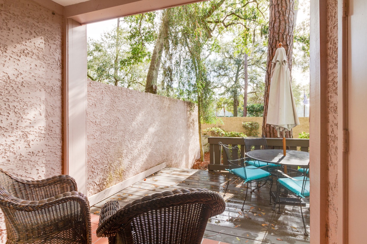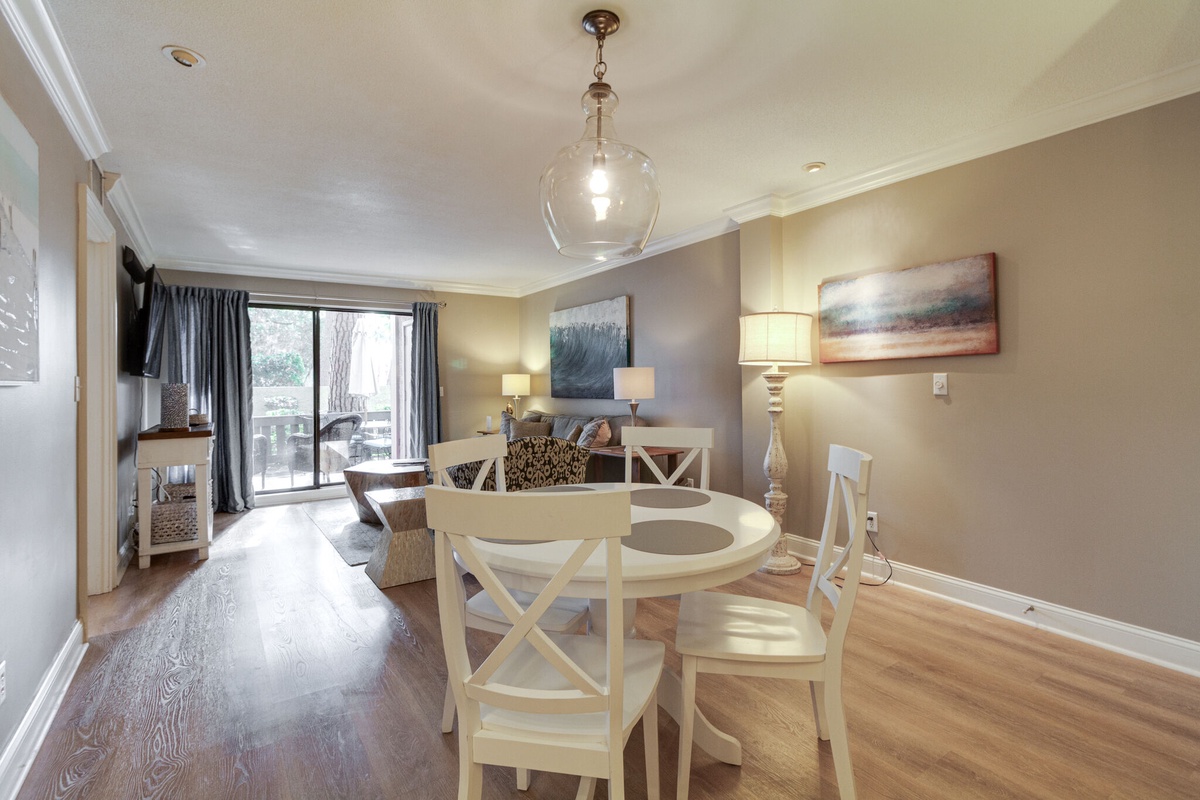 Unwind on the plush sofa and cushioned chair while enjoying entertainment on the large flat screen TV. Slide open the glass door and relax on the spacious outdoor patio. Surrounded by Spanish moss-draped Carolina pines, it’s a moment of pure serenity.