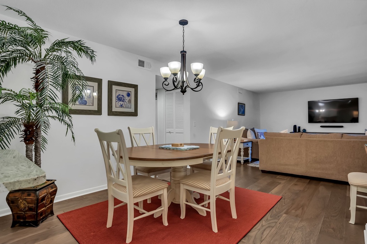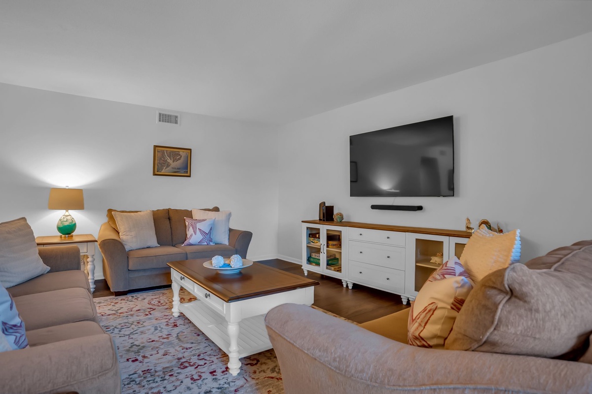 Stepping past the elegant two-tone dining table with seating for six and sidebar, the living room opens before you with sofa, loveseat and extra wide armchair facing a wide flat-screen TV. A set of sliders to one end open wide to an elevated balcony among the treetops, drenched in soothing sea breezes.