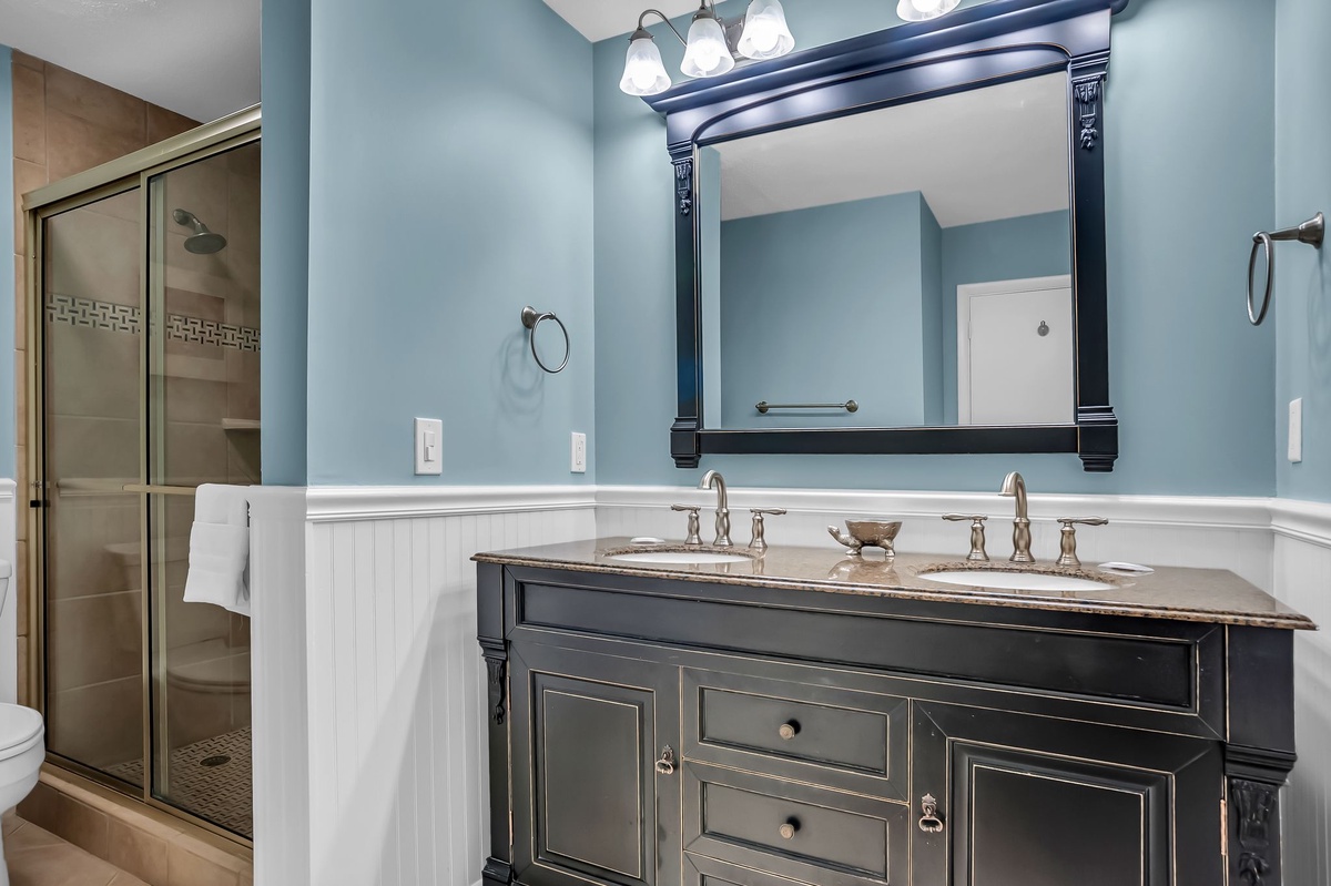 Finally, the primary suite ups the ante with a wide king-size bed set beside floor-to-ceiling window with a flat-screen TV and en suite bath boasting dual-basin vanity and walk-in shower.