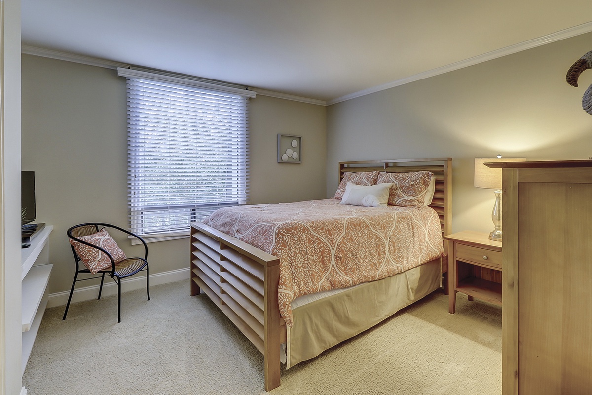 A lovely queen bed in paisley-patterned linens of rich salmon defines the second bedroom, which also enjoys tall windows but adds the homey touch of built-in bookshelves. This room also enjoys a flat-screen TV with DVD player and a private bath with pedestal sink, tub and shower.