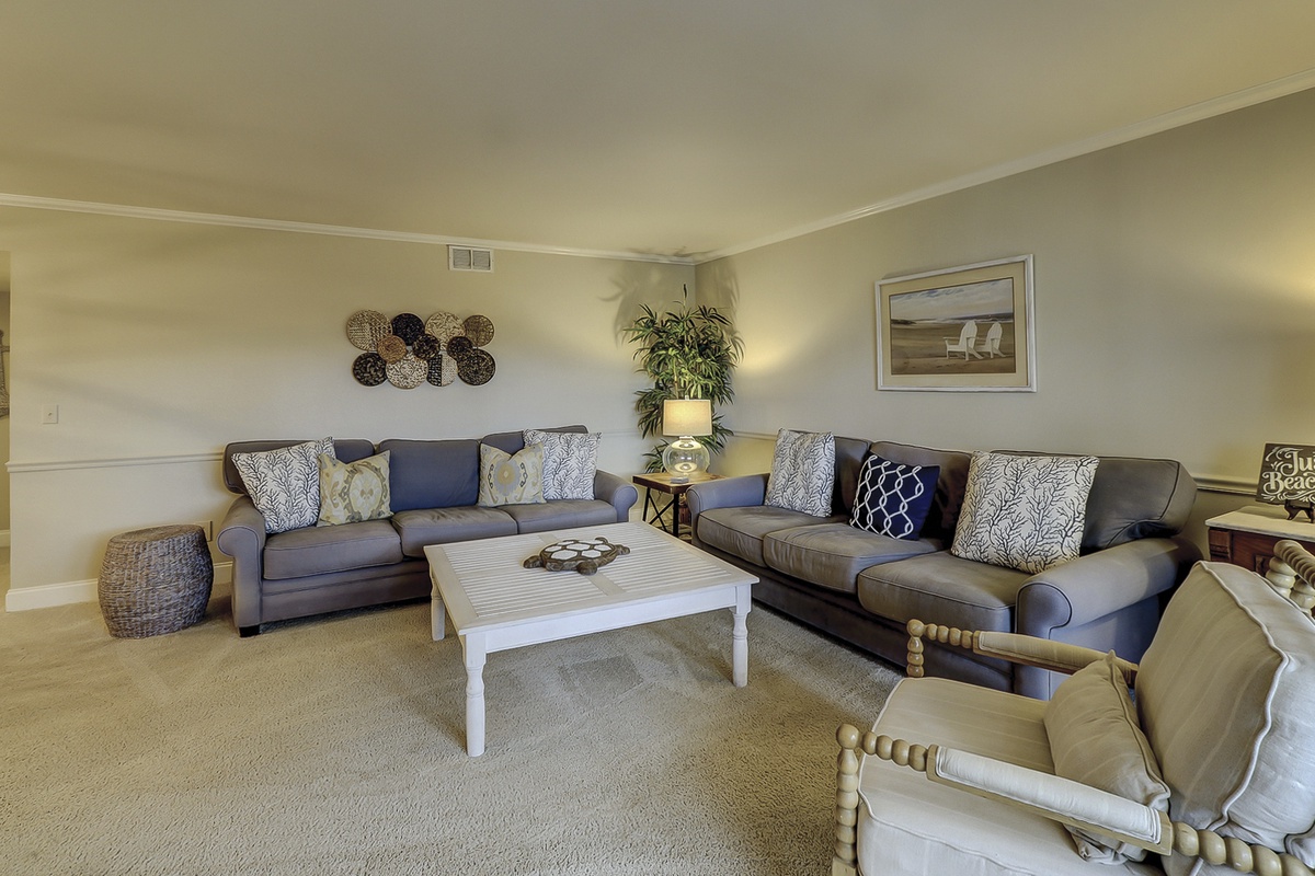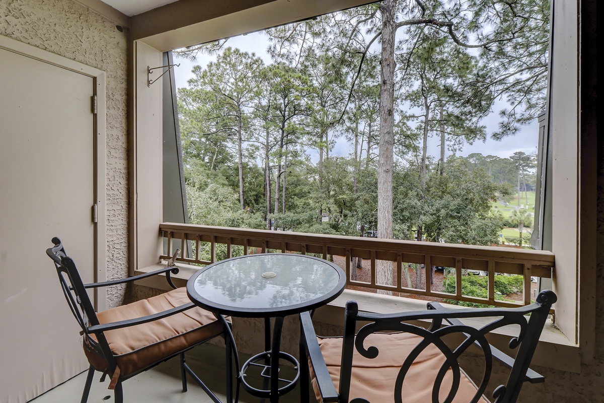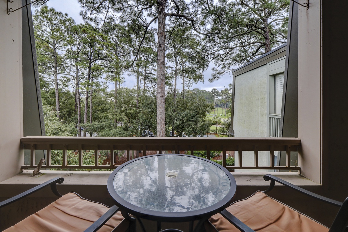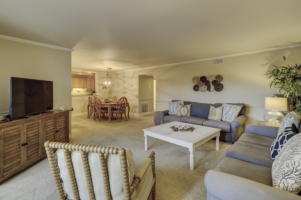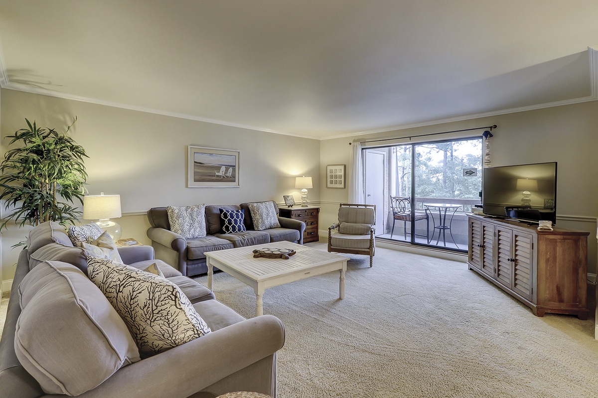 Beyond the dining space, the open floor plan opens up beautifully into a spacious main living area. Here, dual sofas in plush coastal blue upholstery face a massive flat-screen TV. This light and airy room is bathed in natural light streaming in from a wide set of sliding glass doors. Step through them, and you are facing astounding views of Harbour Town Golf Links from the wide perch of a fourth-floor balcony offering high-top seating for two.