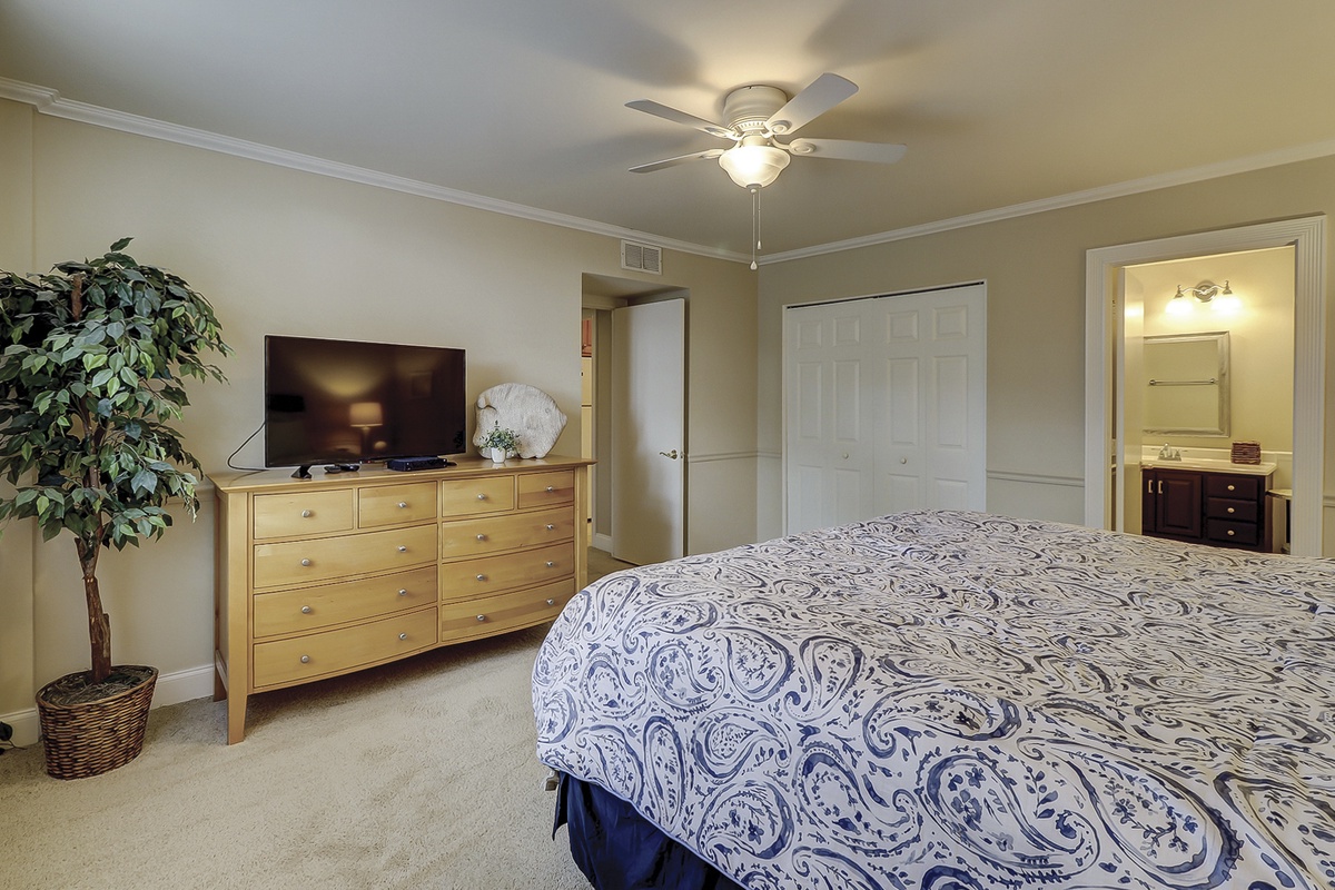 Light and space define a master suite, anchored by a wide king bed in paisley linens of crisp sky blue and white. Tall windows in custom draperies bathe the suite in light, lending opulence to a room that offers a flat-screen TV, coastal-inspired furnishings and an en suite with marbled solid surface single basin vanity, lovely beadboard wainscoting and space tub and shower.