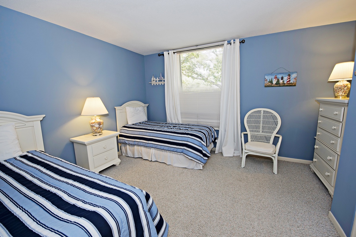 In quiet hues of sand and sky, the second bedroom has a distinctly beach-oriented flavor, with twin beds, white furnishings and a nearby bath with tub/shower combination and a solid surface vanity.