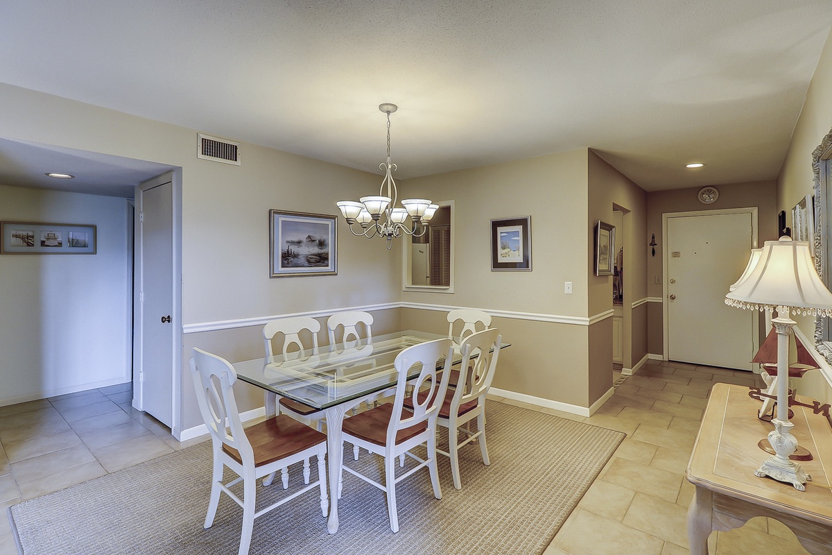 There is a distinct sense of spaciousness in this lovely fourth floor Cutter Court villa, accessible by elevator. Stone flooring begins in the foyer and continues into the open dining and living space. Details such as wainscoting and a mirrored wall enhance this already-charming villa.
