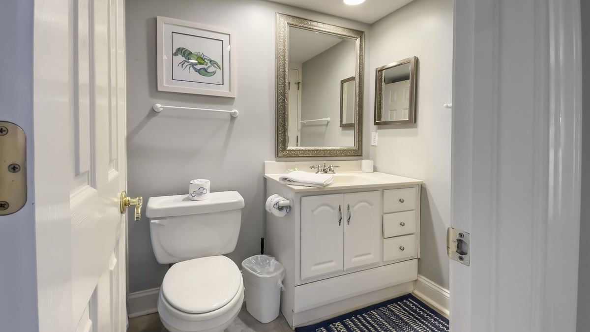 Basking in the waterside view as well, the bedroom features a king-sized bed, lovely furnishings, and a ceiling fan. A corner armoire holds a flat screen TV and DVD. The bathroom offers a cultured marble vanity and stone surrounded tub/shower combination.