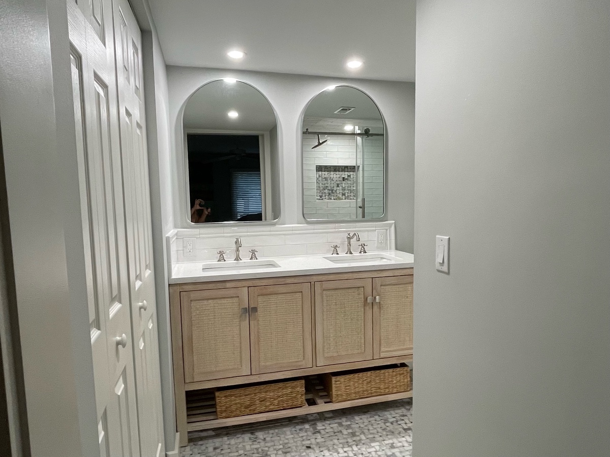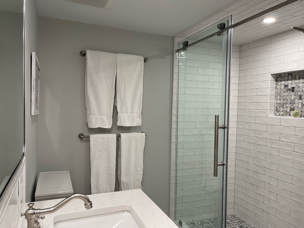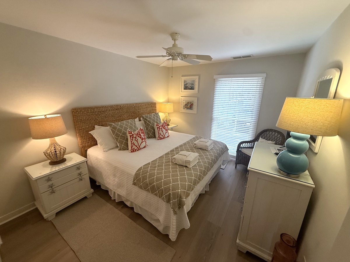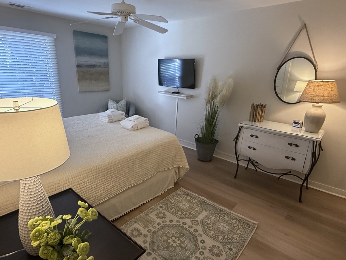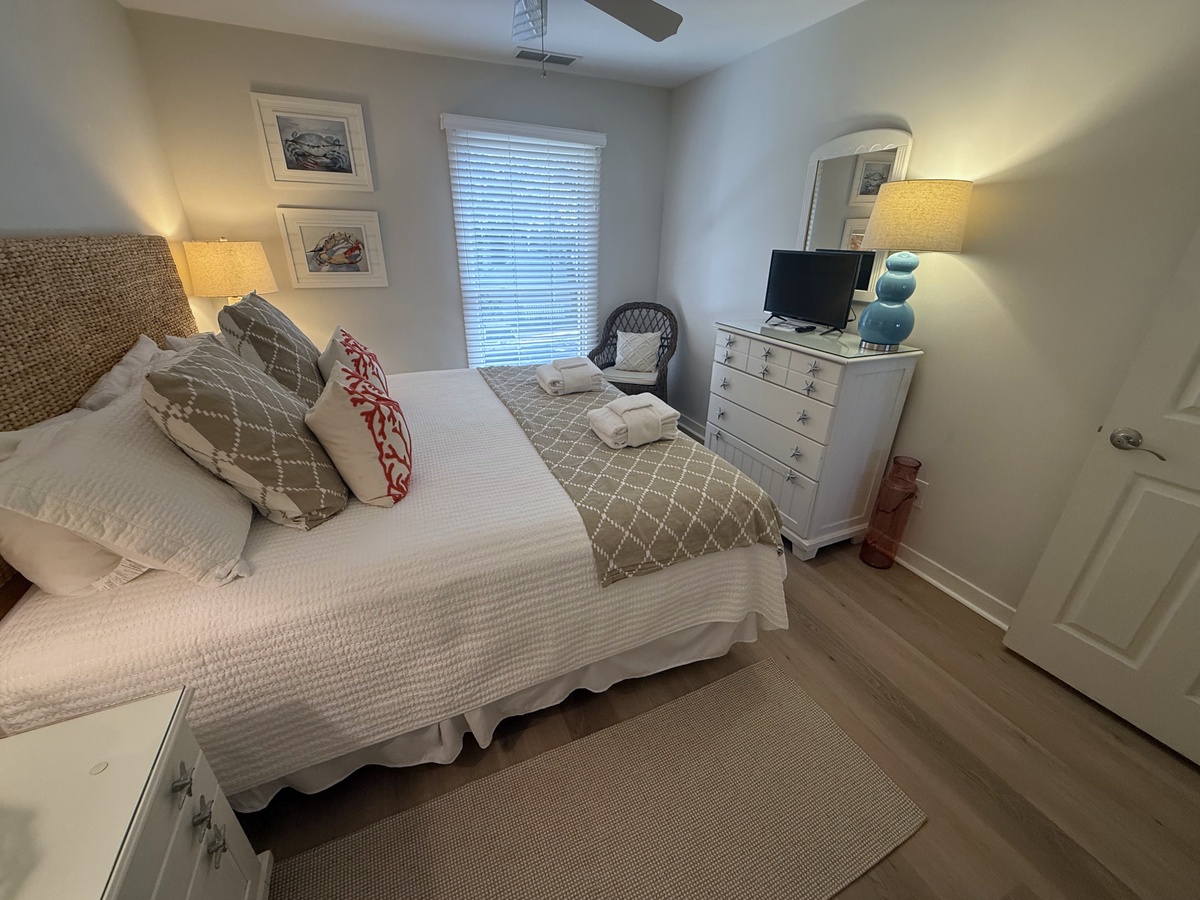The master suite continues the coastal theme with an accent wall of lapboard over a wide king size bed. This retreat offers a large flat-screen TV, ample room and a en suite with a walk-in shower.
