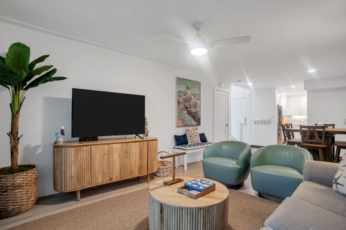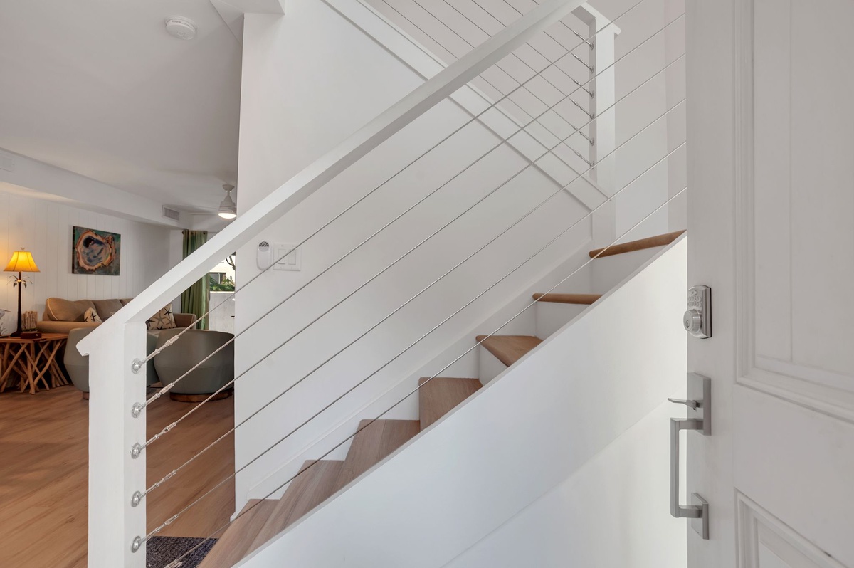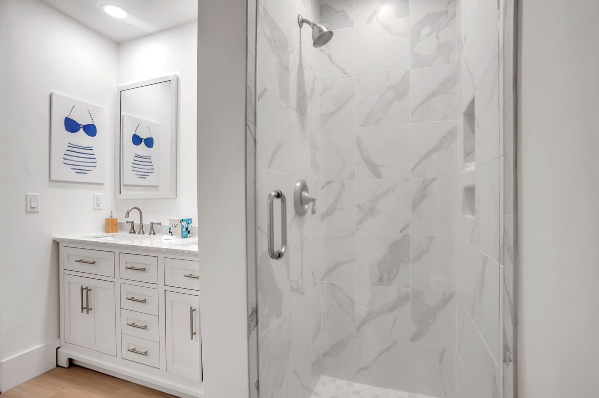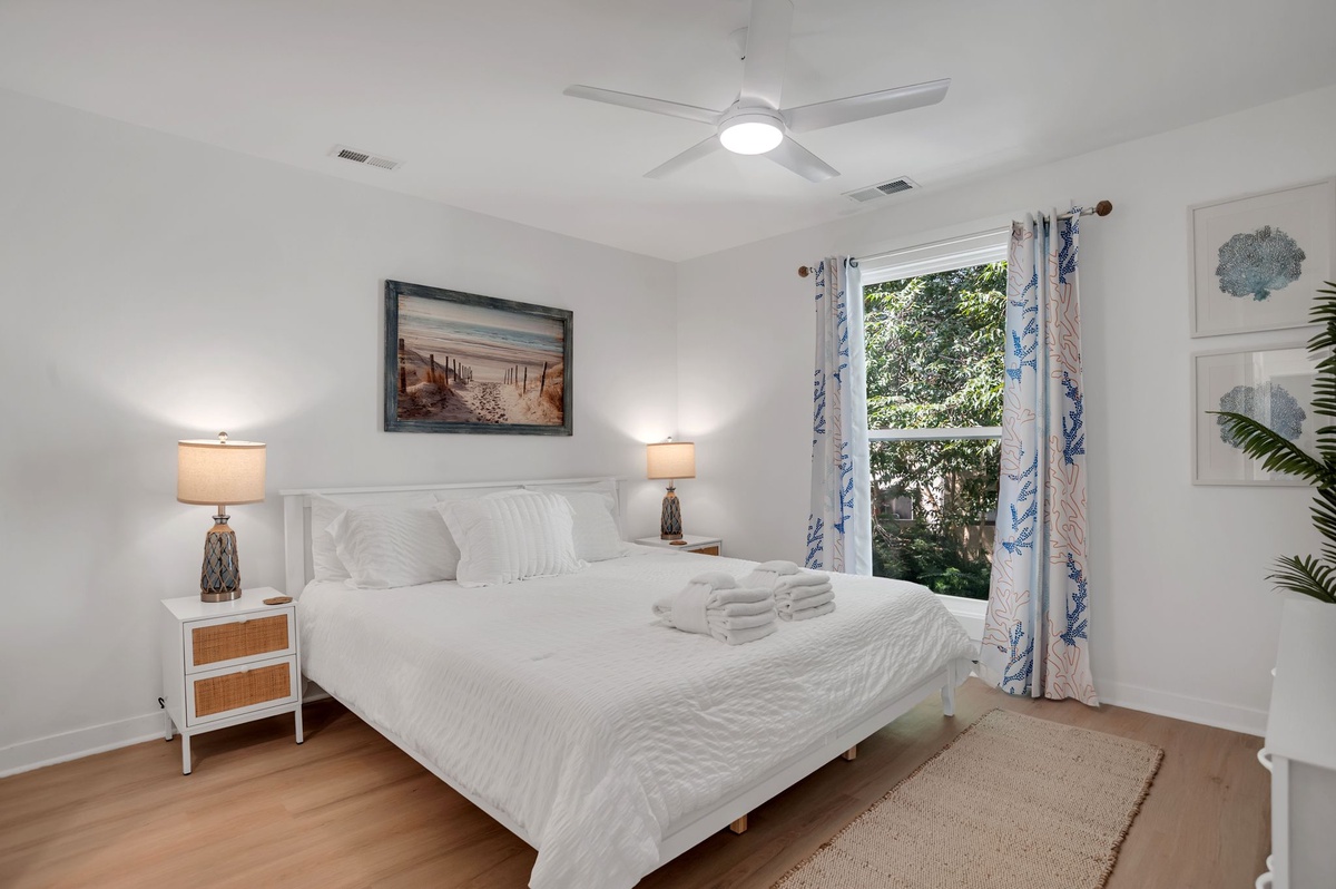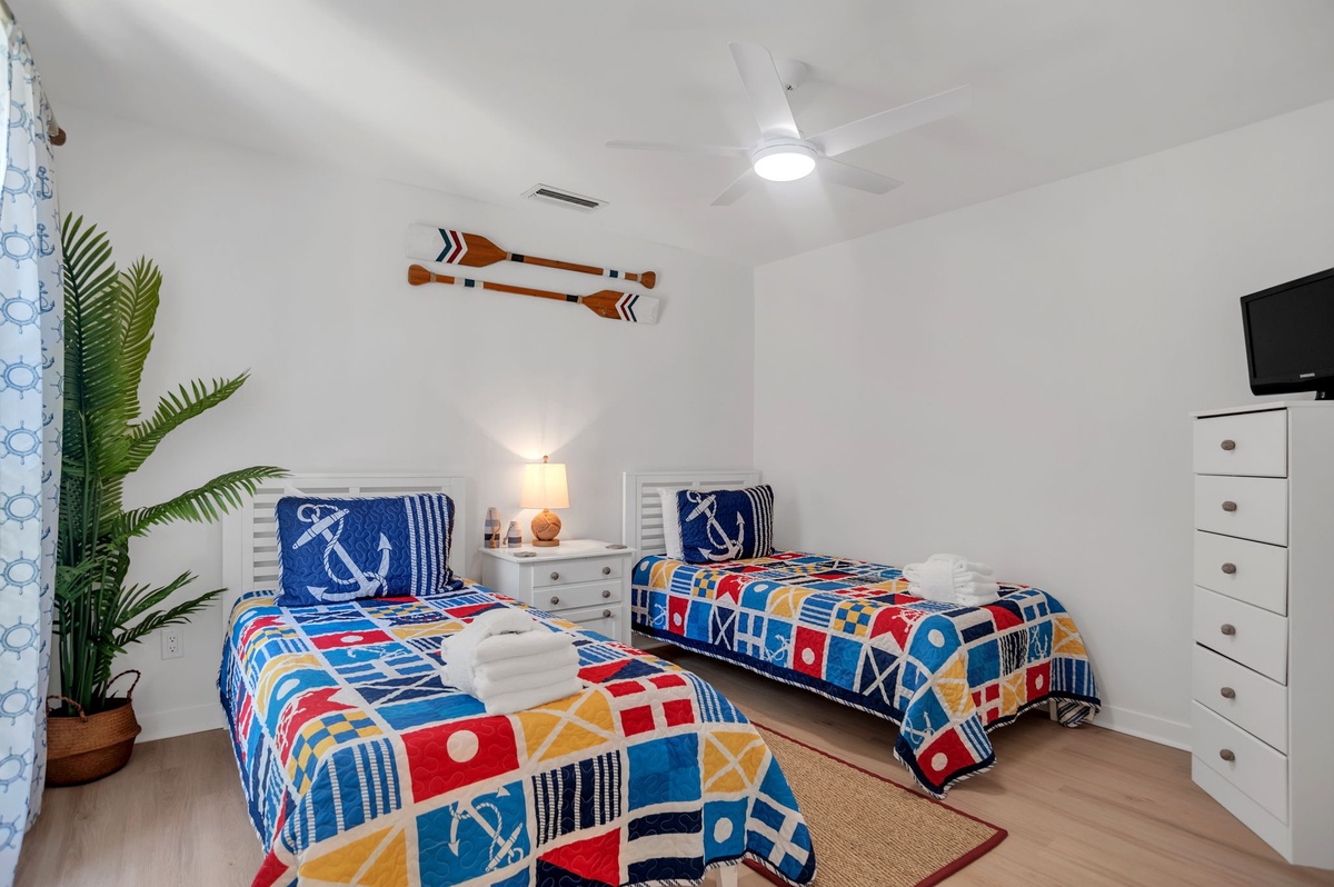 The villa’s two en suite bedrooms can be found on the second floor. Both enjoy private baths, ceiling fans and flat-screen TVs, with one suite offering dual twin beds and the primary suite offering a plush king-size bed.