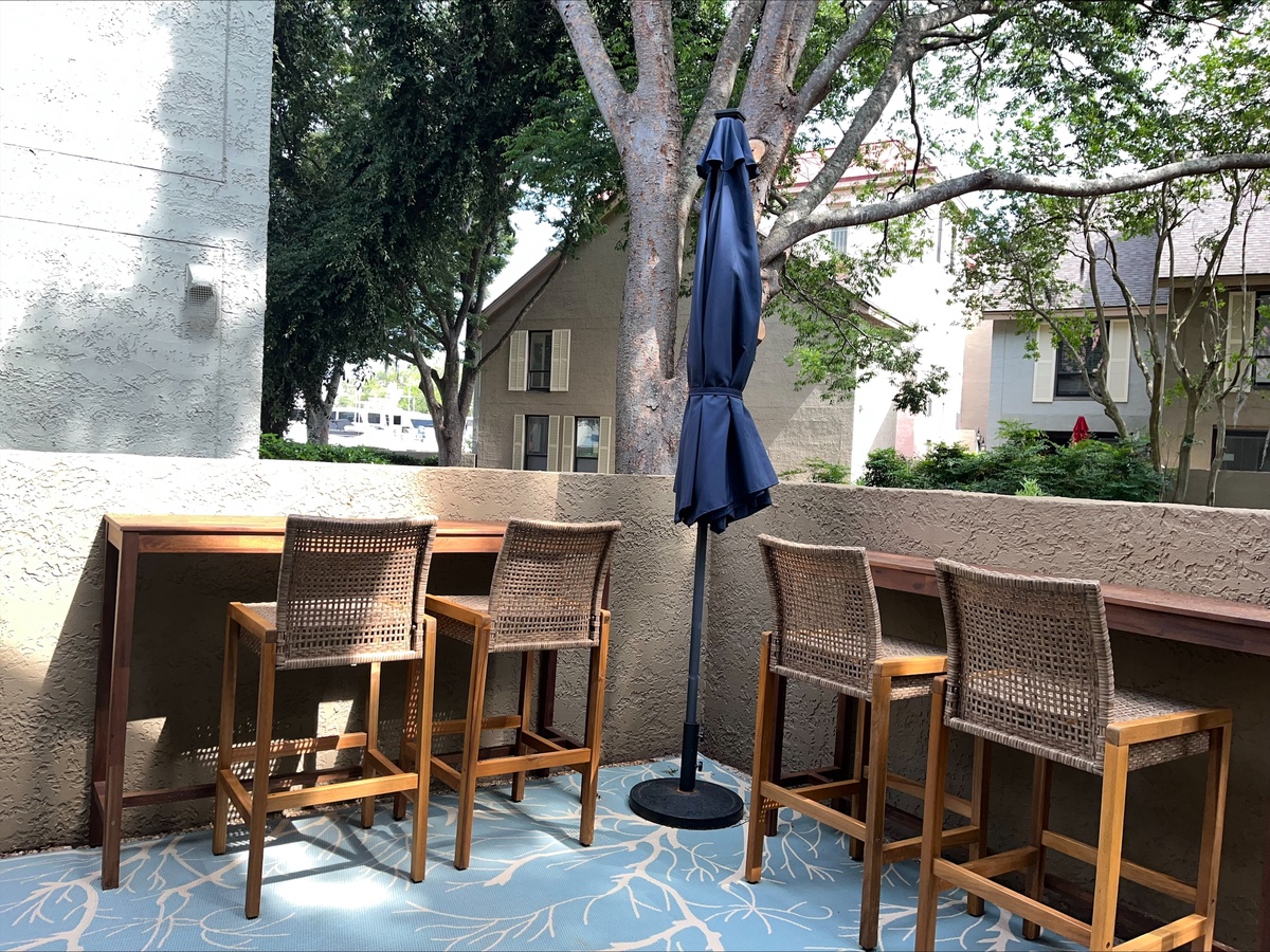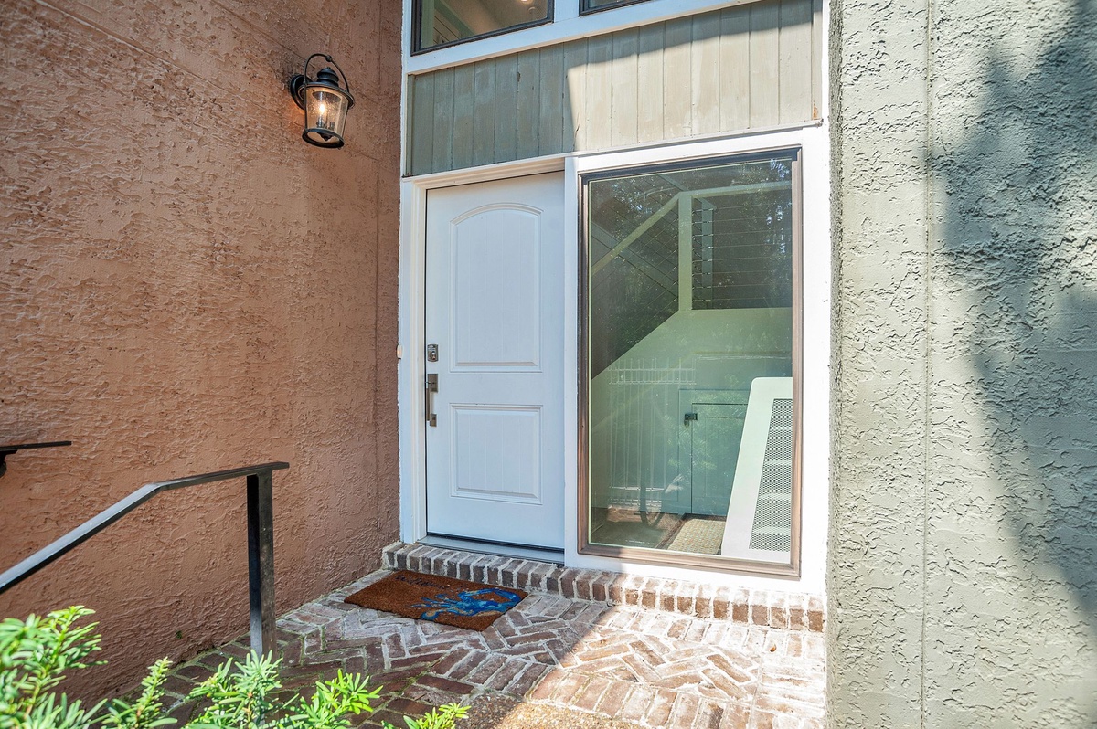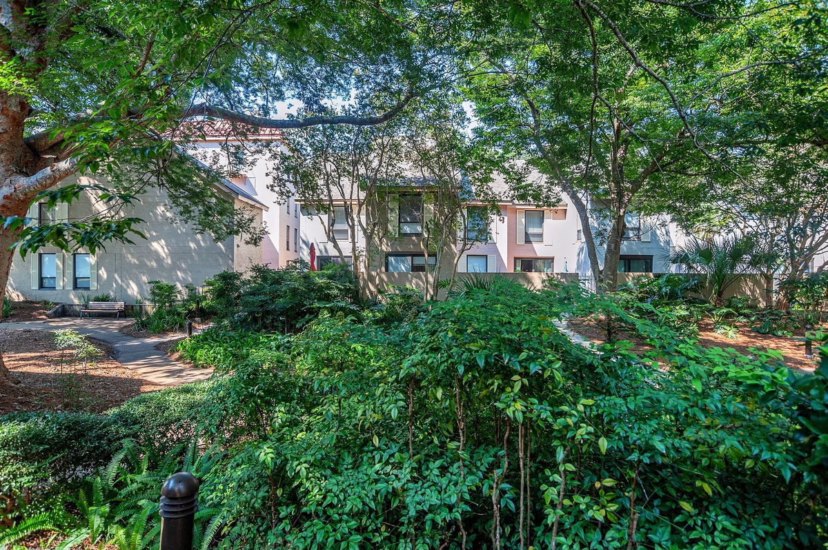 At the far end, bathing in the light of those windows, a comfortable living room sees a sleeper sofa and dual armchairs set to enjoy both sunlight and a large flat-screen TV. And by opening those sliding glass doors wide, you’re immersed in the waterside beauty of a private walled patio, with al fresco dining for four and Harbour Town just a short walk beyond the iron gate.