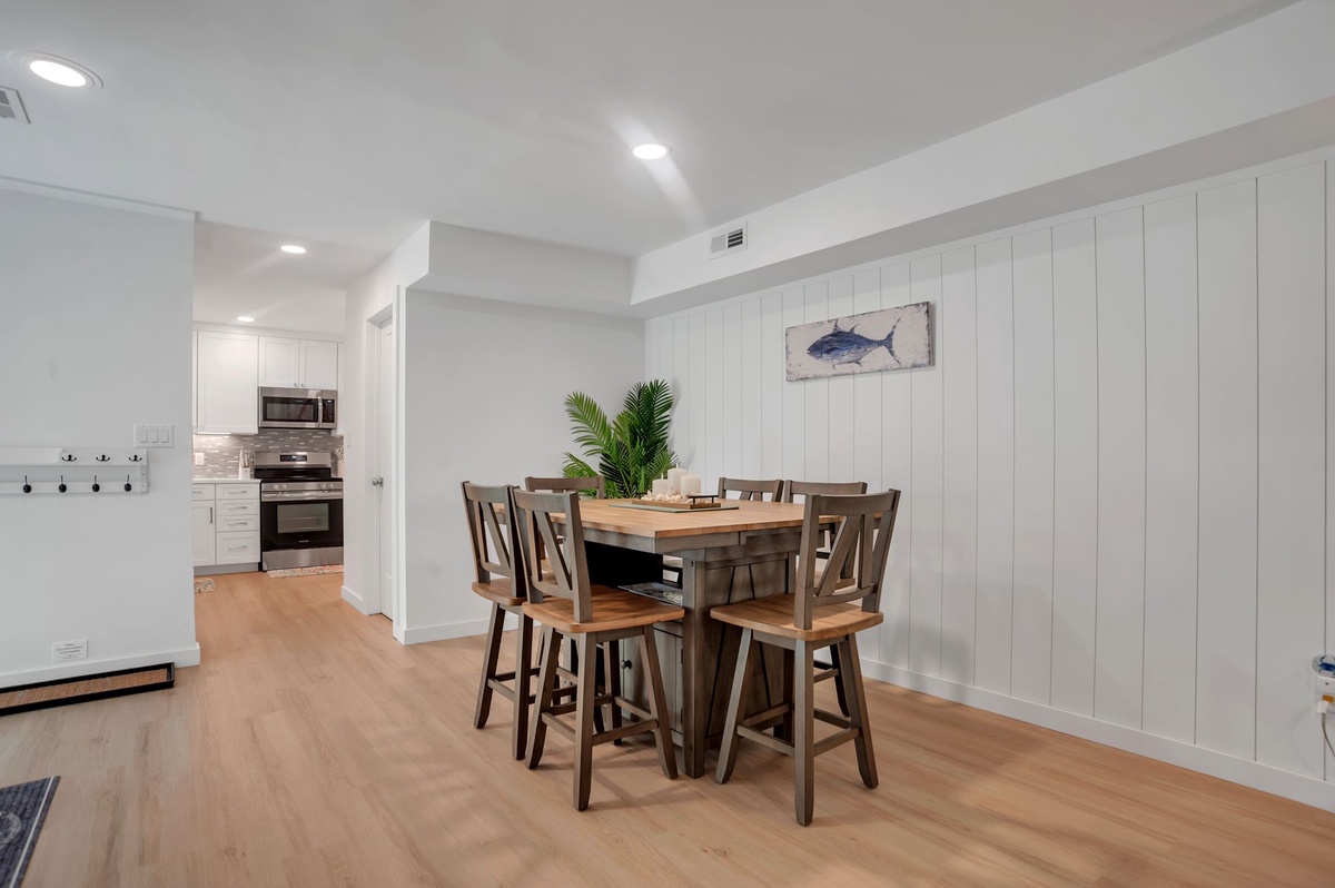 Stretching away from you up on entry, the main living space breathes in oak-shaded views just beyond a wide set of sliders at one end. Enjoying this open airiness is the dining room with seating for six around an industrial style table, convenient to the gourmet kitchen whose quartz counters encircled a full suite of updated stainless-steel appliances.