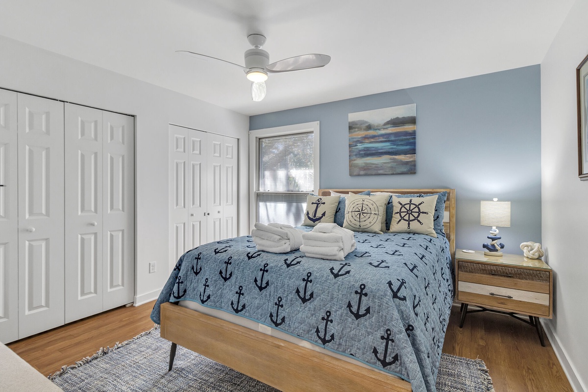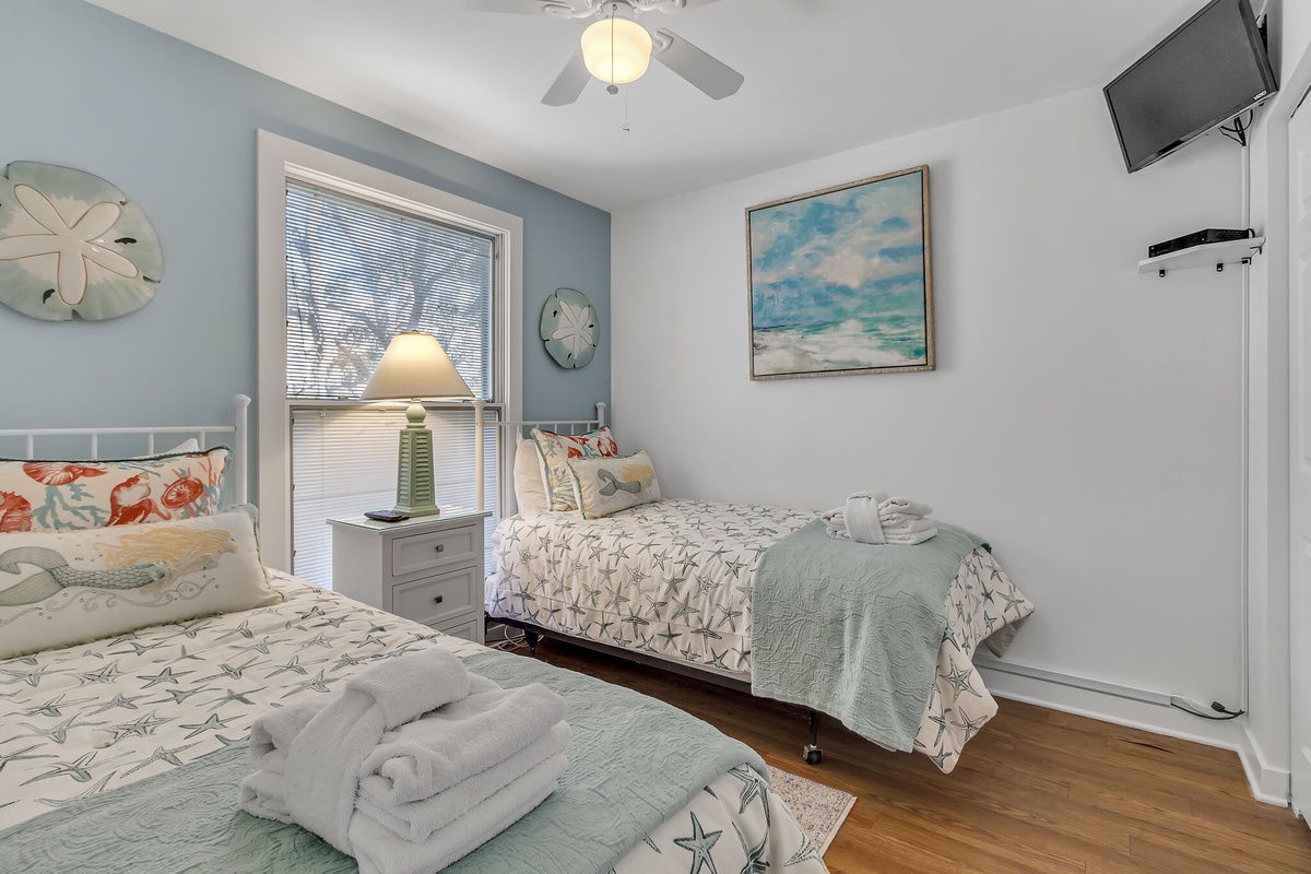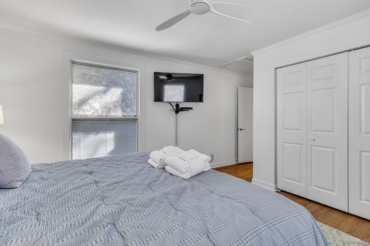 The master bedroom exudes coastal elegance with its king-size bed, flat-screen TV, and ceiling fan, complemented by a spacious en-suite bathroom with a walk-in shower.